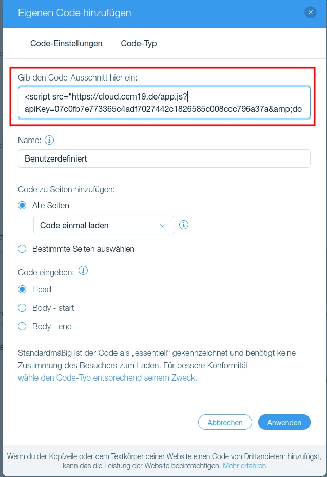 In dem neuen Fenster finden Sie ein Feld mit der Beschriftung 'Gib den Code-Ausschnitt hier ein'. Fügen Sie dort den CCM19-Code ein.