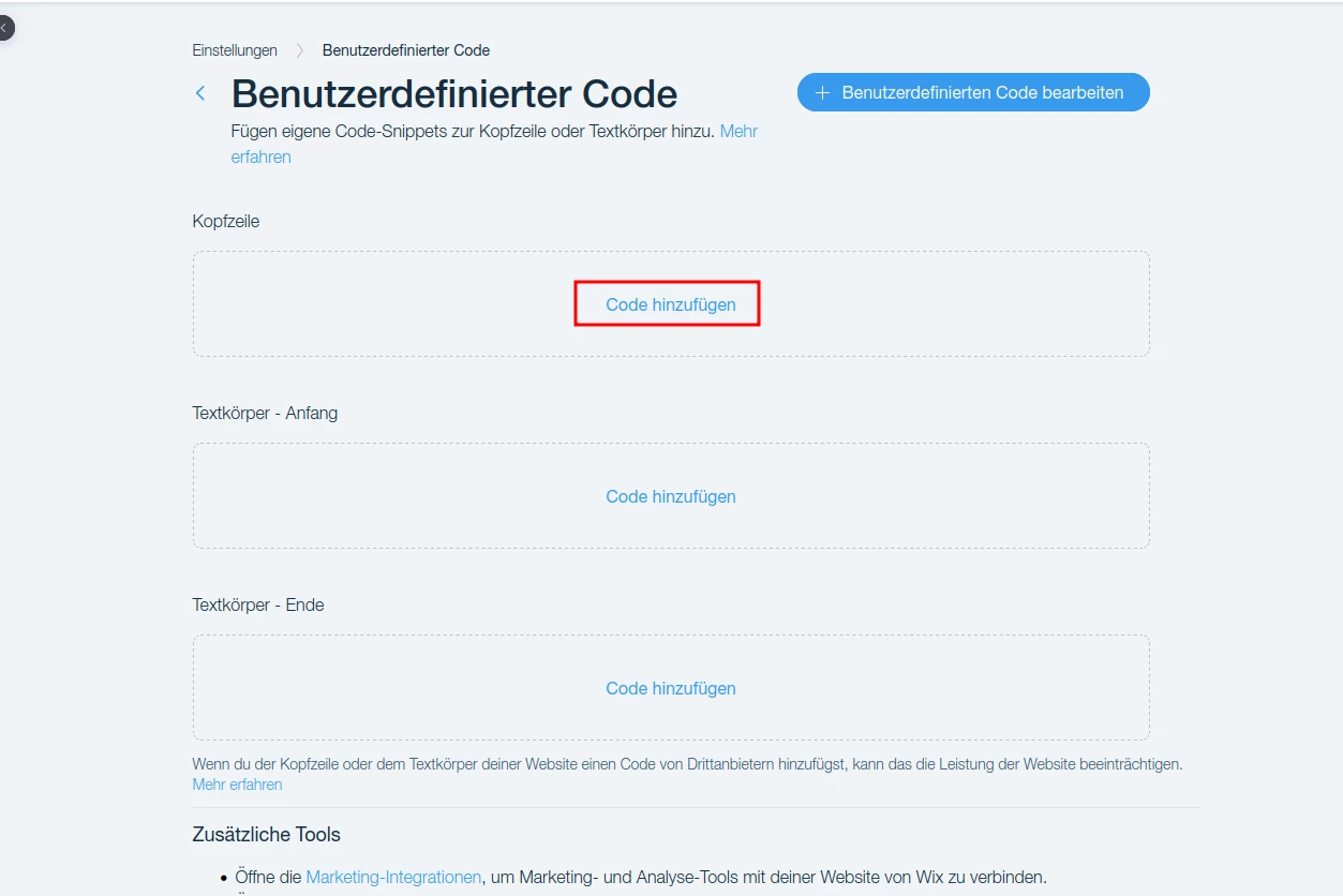 In den Einstellungen scrollen Sie nach unten, bis zum Punkt "Benutzerdefinierter Code". Klicken Sie darauf, um das Feld für das Einfügen des Codes zu öffnen.