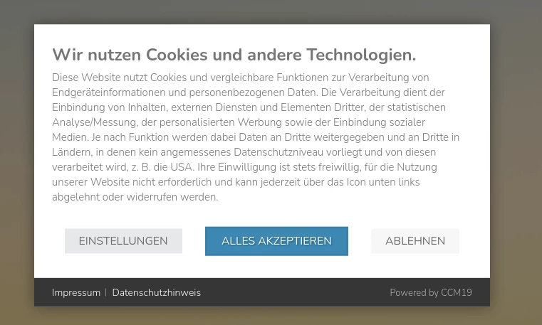 - Einwilligungsoptionen: Es sollte Optionen geben, mit denen Nutzer ihre Zustimmung erteilen oder verweigern können. Dies kann durch Buttons wie "Akzeptieren" bzw. "Ablehnen" erfolgen.