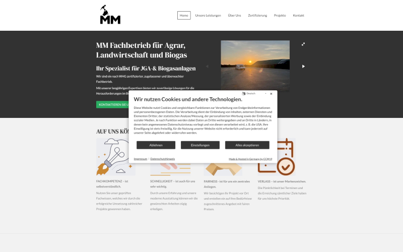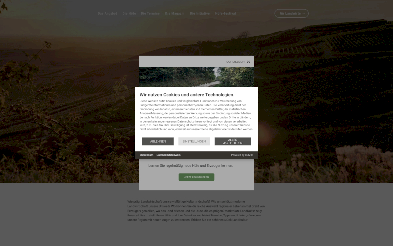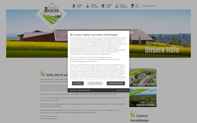 Das Herzstück von CCM19 für Ihre Agrarwirtschaft Webseite, Onlineshop oder sonstige Applikation - der Cookie Banner für Agrarwirtschaft. Mit diesem Banner realisieren Sie auf Ihrer Webseite die notwendige Zustimmung zum Setzen von diversen Cookies und zum ausführen von (Tracking)Skripten.