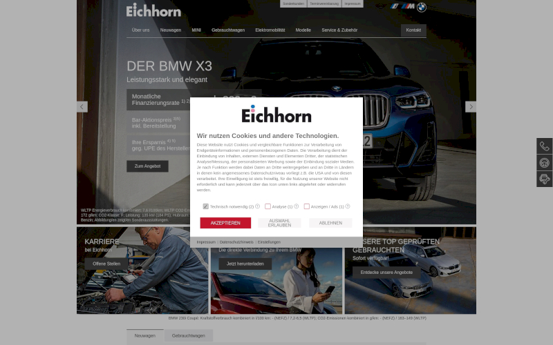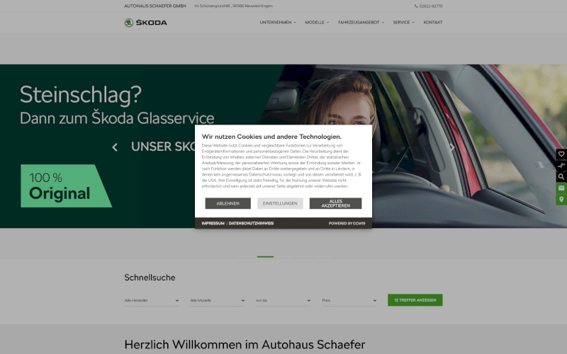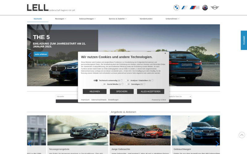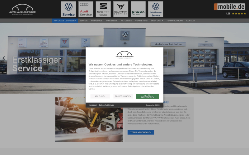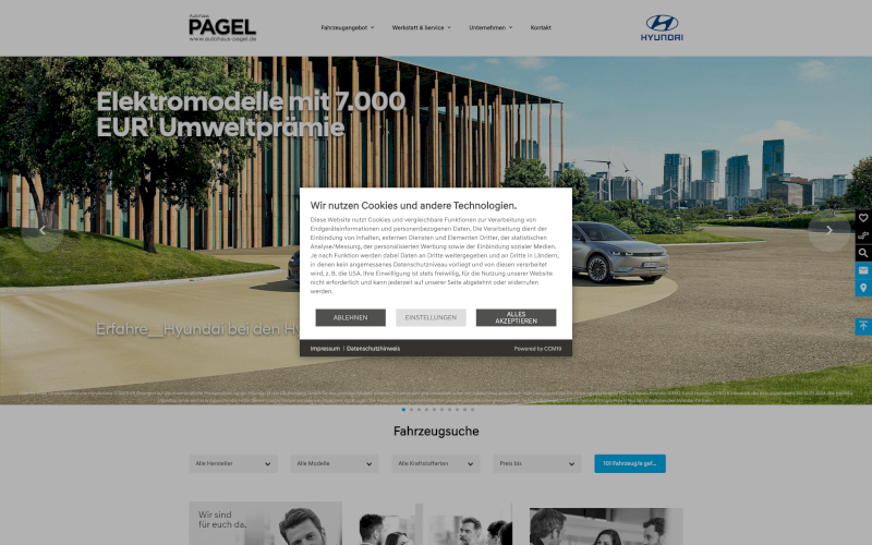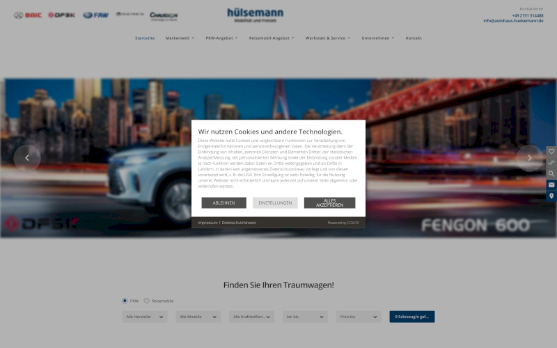 Das Herzstück von CCM19 für Ihre Autohäuser Webseite, Onlineshop oder sonstige Applikation - der Cookie Banner für Autohäuser. Mit diesem Banner realisieren Sie auf Ihrer Webseite die notwendige Zustimmung zum Setzen von diversen Cookies und zum ausführen von (Tracking)Skripten.