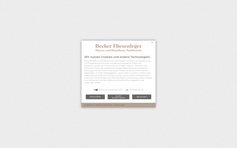 Das Herzstück von CCM19 für Ihre Bauhandwerksbetriebe Webseite, Onlineshop oder sonstige Applikation - der Cookie Banner für Bauhandwerksbetriebe. Mit diesem Banner realisieren Sie auf Ihrer Webseite die notwendige Zustimmung zum Setzen von diversen Cookies und zum ausführen von (Tracking)Skripten.