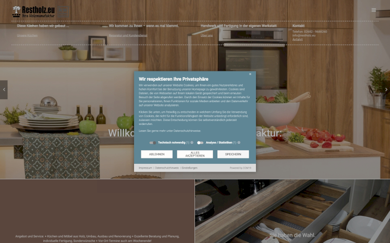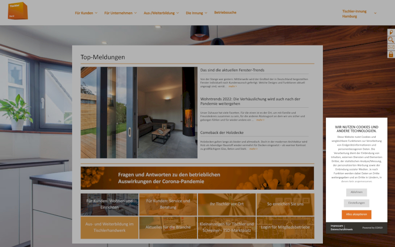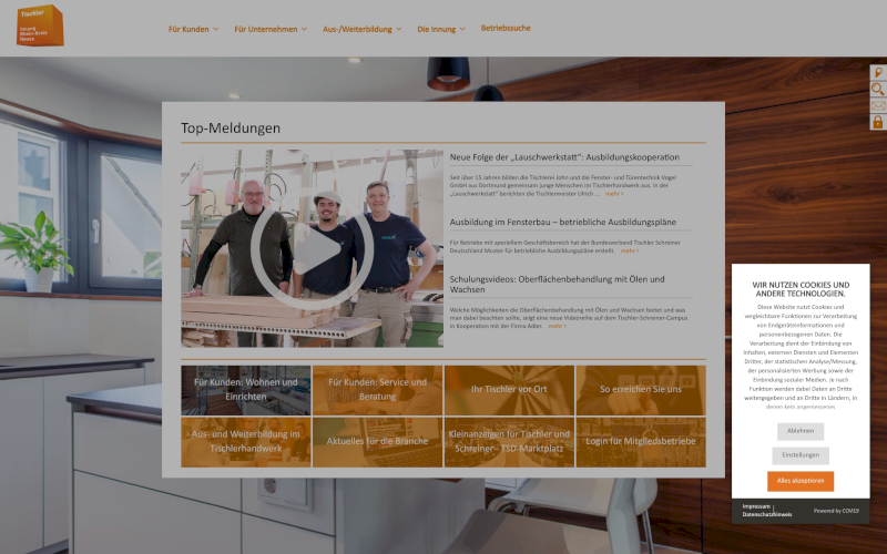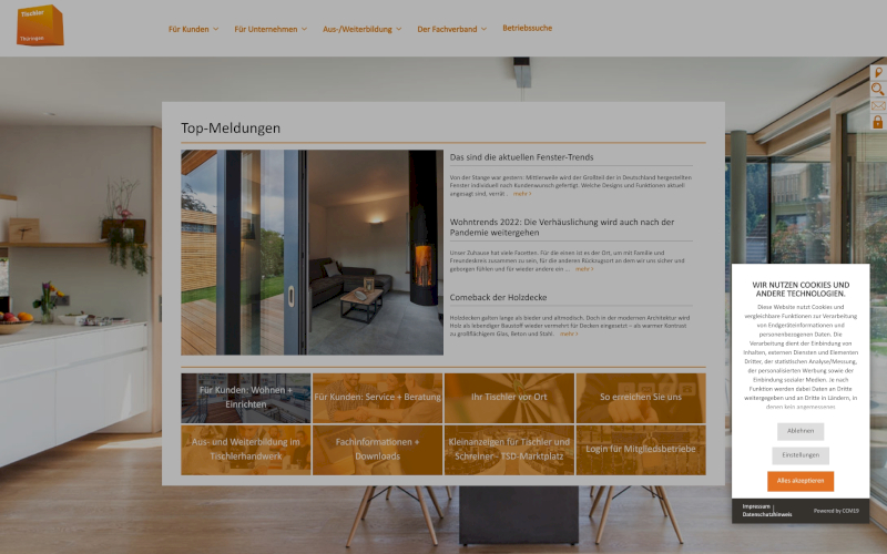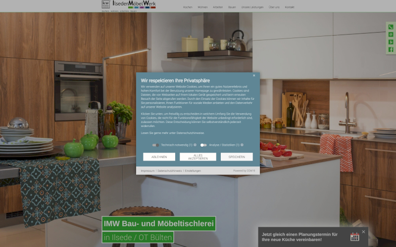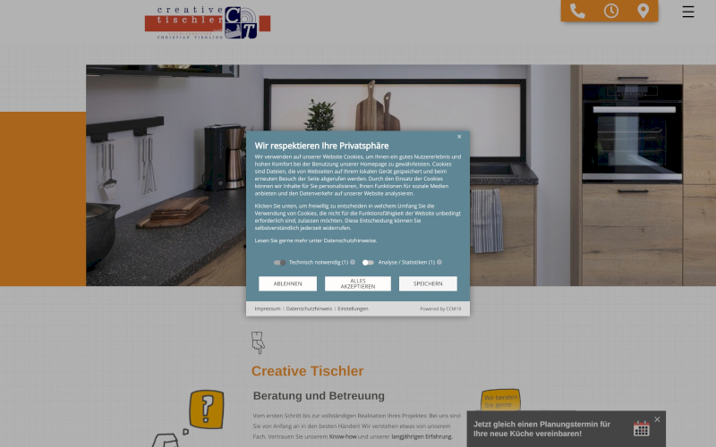 Das Herzstück von CCM19 für Ihre Bautischler Webseite, Onlineshop oder sonstige Applikation - der Cookie Banner für Bautischler. Mit diesem Banner realisieren Sie auf Ihrer Webseite die notwendige Zustimmung zum Setzen von diversen Cookies und zum ausführen von (Tracking)Skripten.