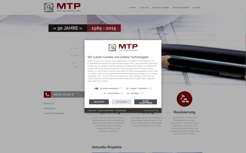 Das Herzstück von CCM19 für Ihre Bauträger Webseite, Onlineshop oder sonstige Applikation - der Cookie Banner für Bauträger. Mit diesem Banner realisieren Sie auf Ihrer Webseite die notwendige Zustimmung zum Setzen von diversen Cookies und zum ausführen von (Tracking)Skripten.