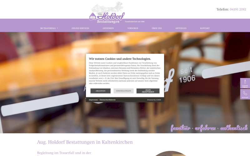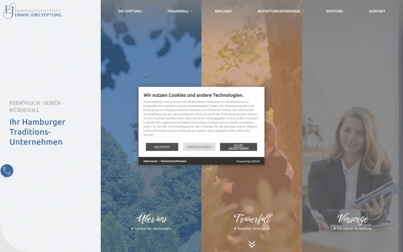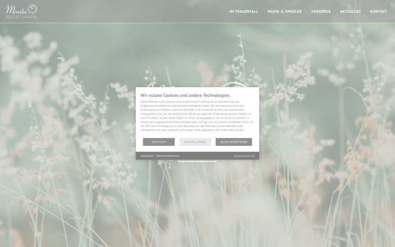 Suchen Sie den optimalen Cookie Consent Manager speziell für Bestatter? Entdecken Sie CCM19 - Ihre maßgeschneiderte Lösung! Erhöhen Sie Ihre Consent-Raten mit einer Lösung, die Datenschutz ernst nimmt, komplett in Deutschland gehostet und für Bestatter entwickelt wurde.
