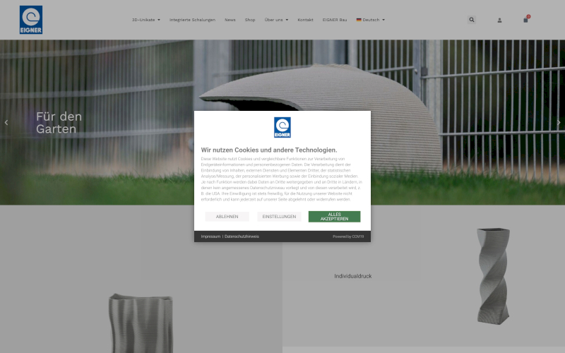 Das Herzstück von CCM19 für Ihre Betonhersteller Webseite, Onlineshop oder sonstige Applikation - der Cookie Banner für Betonhersteller. Mit diesem Banner realisieren Sie auf Ihrer Webseite die notwendige Zustimmung zum Setzen von diversen Cookies und zum ausführen von (Tracking)Skripten.