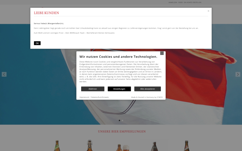 Das Herzstück von CCM19 für Ihre Brauereien Webseite, Onlineshop oder sonstige Applikation - der Cookie Banner für Brauereien. Mit diesem Banner realisieren Sie auf Ihrer Webseite die notwendige Zustimmung zum Setzen von diversen Cookies und zum ausführen von (Tracking)Skripten.