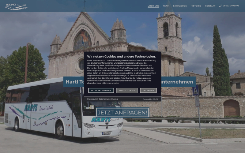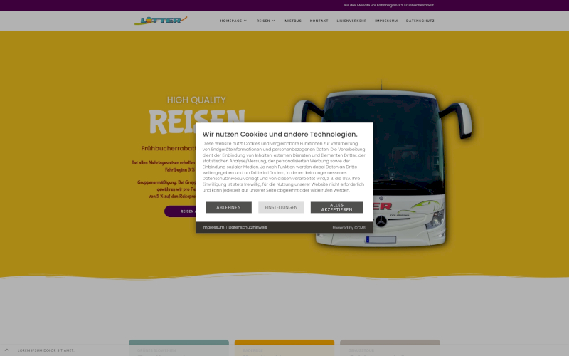 Das Herzstück von CCM19 für Ihre Busunternehmen Webseite, Onlineshop oder sonstige Applikation - der Cookie Banner für Busunternehmen. Mit diesem Banner realisieren Sie auf Ihrer Webseite die notwendige Zustimmung zum Setzen von diversen Cookies und zum ausführen von (Tracking)Skripten.