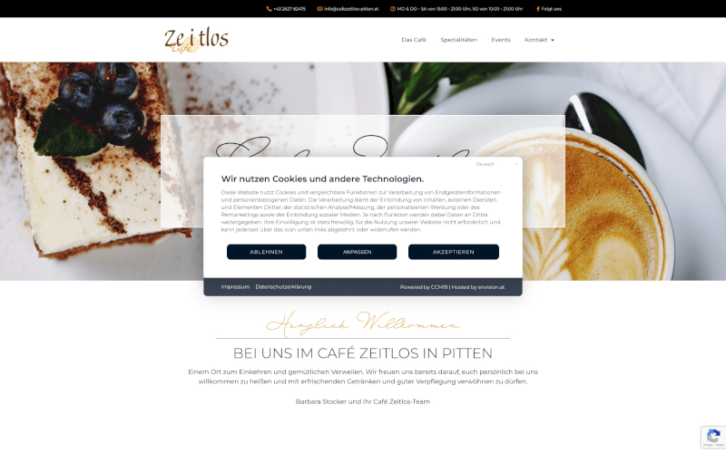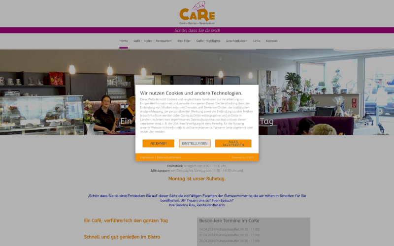 Entdecken Sie den optimalen Cookie Consent Manager speziell für Cafés: CCM19 steigert die Zustimmung Ihrer Besucher effektiv! Mit CCM19 genießen Sie eine richtungweisende Lösung für Datenschutz – kein Datenfluss ins Ausland, perfekt abgestimmt auf Cafés.