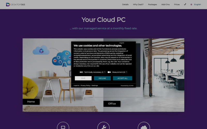 Das Herzstück von CCM19 für Ihre Cloud Computing Webseite, Onlineshop oder sonstige Applikation - der Cookie Banner für Cloud Computing. Mit diesem Banner realisieren Sie auf Ihrer Webseite die notwendige Zustimmung zum Setzen von diversen Cookies und zum ausführen von (Tracking)Skripten.