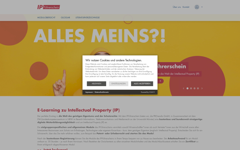 Das Herzstück von CCM19 für Ihre E-Learning Webseite, Onlineshop oder sonstige Applikation - der Cookie Banner für E-Learning. Mit diesem Banner realisieren Sie auf Ihrer Webseite die notwendige Zustimmung zum Setzen von diversen Cookies und zum ausführen von (Tracking)Skripten.