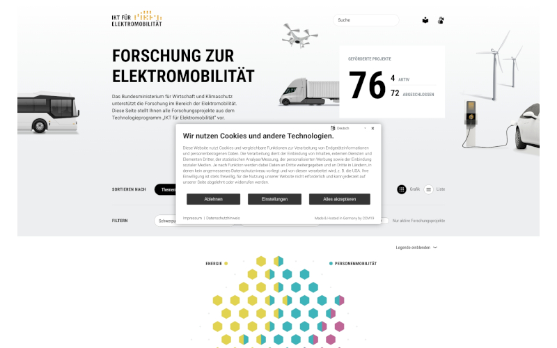 Das Herzstück von CCM19 für Ihre E-Mobilität Webseite, Onlineshop oder sonstige Applikation - der Cookie Banner für E-Mobilität. Mit diesem Banner realisieren Sie auf Ihrer Webseite die notwendige Zustimmung zum Setzen von diversen Cookies und zum ausführen von (Tracking)Skripten.