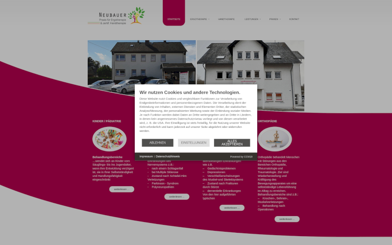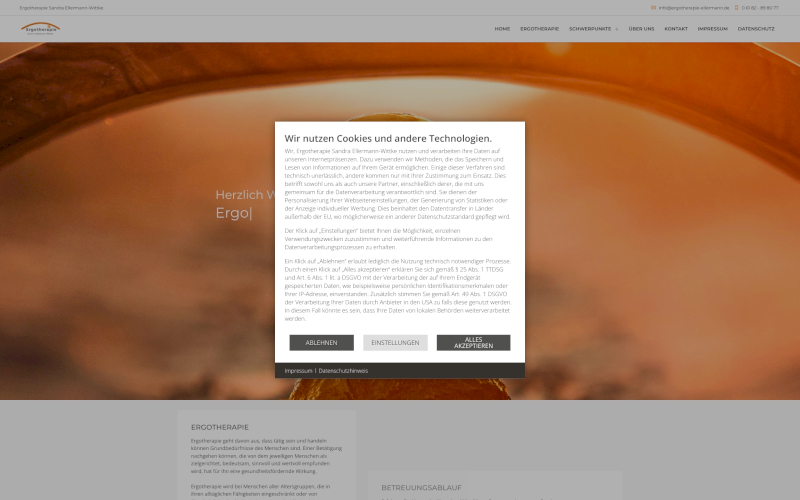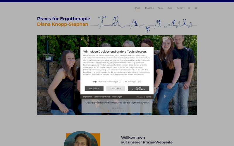 Das Herzstück von CCM19 für Ihre Ergotherapeuten Webseite, Onlineshop oder sonstige Applikation - der Cookie Banner für Ergotherapeuten. Mit diesem Banner realisieren Sie auf Ihrer Webseite die notwendige Zustimmung zum Setzen von diversen Cookies und zum ausführen von (Tracking)Skripten.