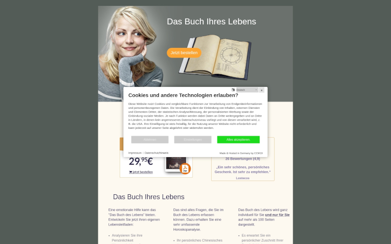 Entdecken Sie CCM19: Der optimierte Cookie Consent Manager speziell für die Esoterik-Branche. Mehr Zustimmung, echter Support!Wählen Sie Sicherheit & Effizienz mit CCM19 - entwickelt um Ihre Esoterik-Webpräsenz zu verstärken, ohne Datenübertragung ins Ausland.
