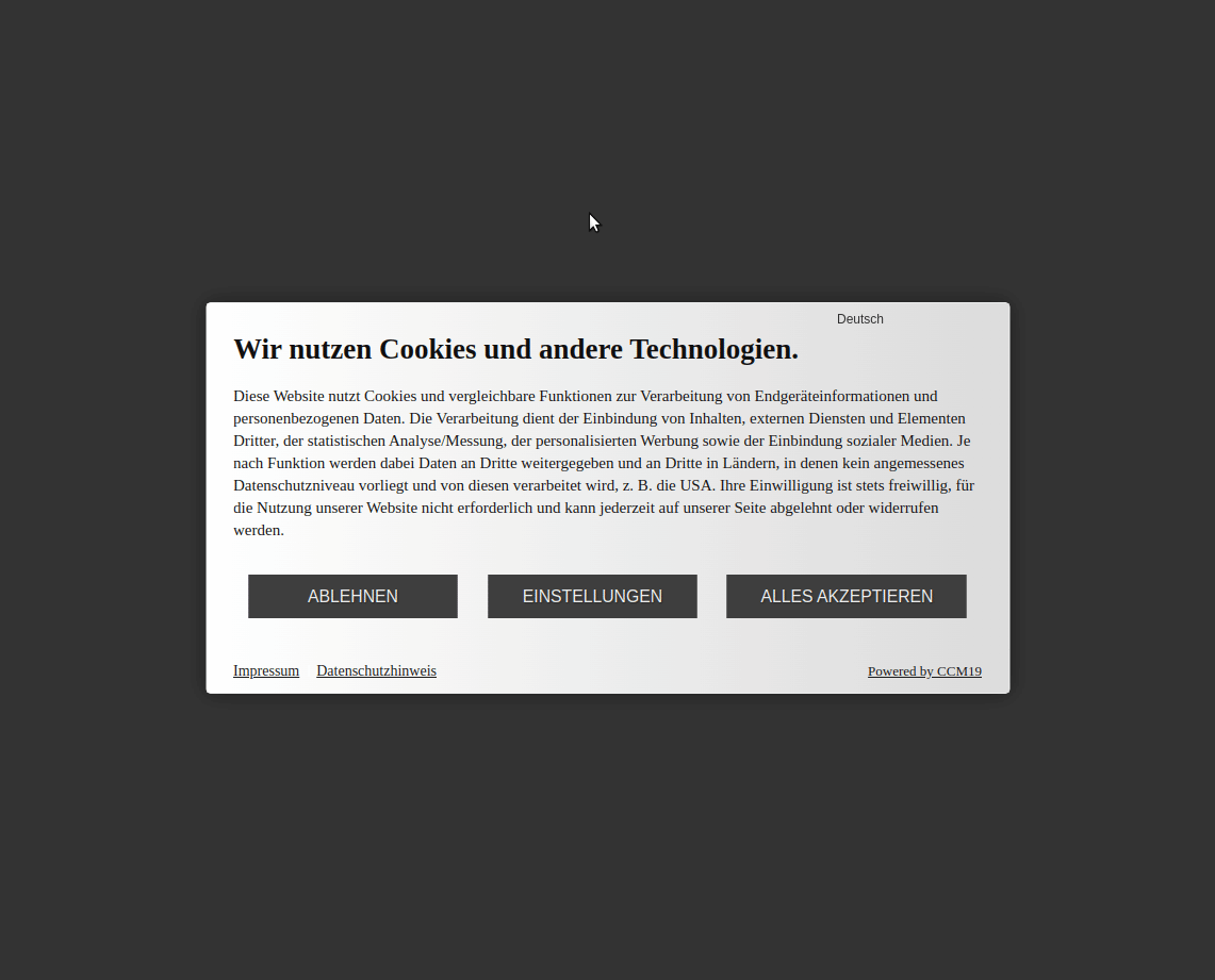 Das Herzstück von CCM19 für Ihre Feuerwehren Webseite, Onlineshop oder sonstige Applikation - der Cookie Banner für Feuerwehren. Mit diesem Banner realisieren Sie auf Ihrer Webseite die notwendige Zustimmung zum Setzen von diversen Cookies und zum ausführen von (Tracking)Skripten.