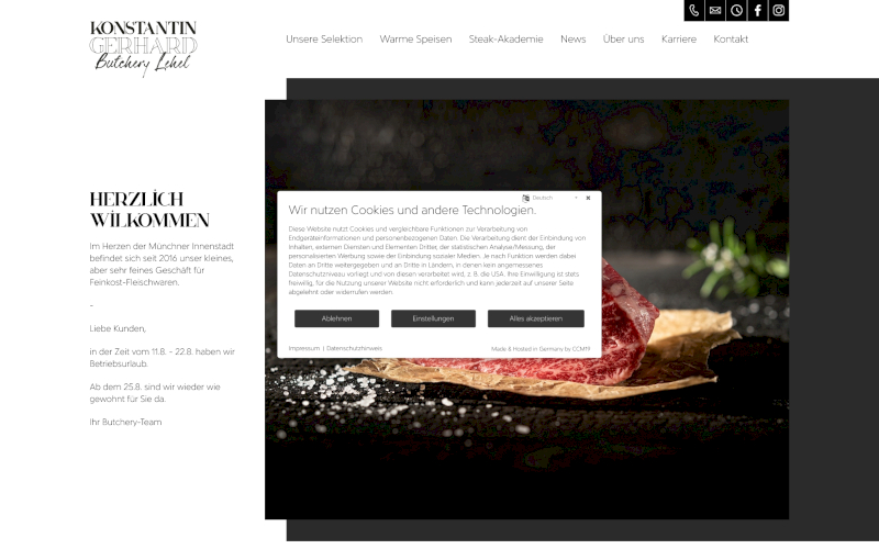 Das Herzstück von CCM19 für Ihre Fleischereien Webseite, Onlineshop oder sonstige Applikation - der Cookie Banner für Fleischereien. Mit diesem Banner realisieren Sie auf Ihrer Webseite die notwendige Zustimmung zum Setzen von diversen Cookies und zum ausführen von (Tracking)Skripten.