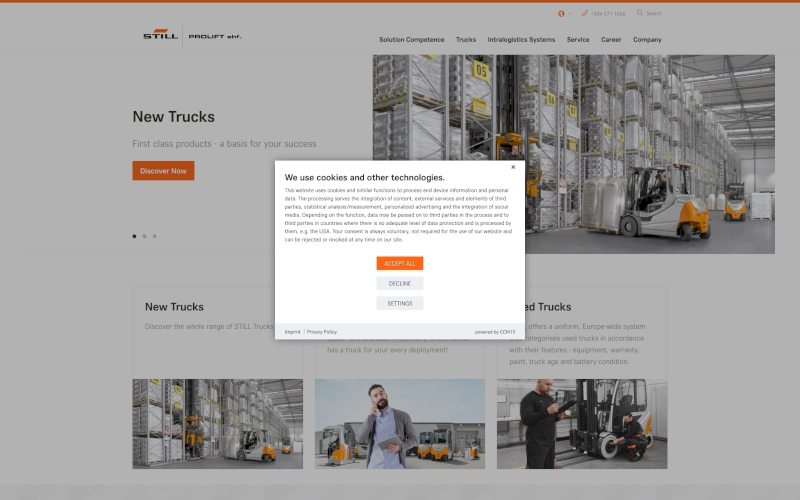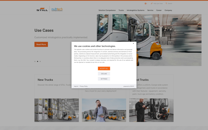 Das Herzstück von CCM19 für Ihre Fördertechnik Webseite, Onlineshop oder sonstige Applikation - der Cookie Banner für Fördertechnik. Mit diesem Banner realisieren Sie auf Ihrer Webseite die notwendige Zustimmung zum Setzen von diversen Cookies und zum ausführen von (Tracking)Skripten.