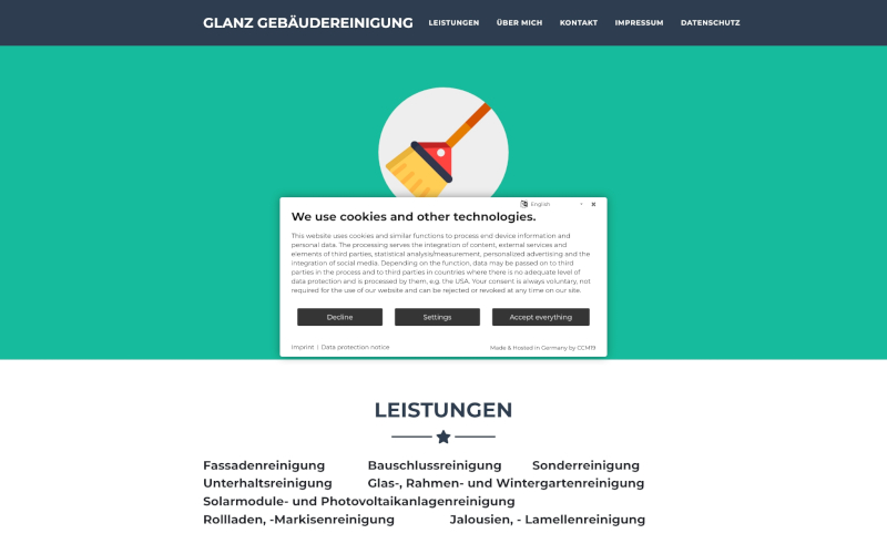 Entdecken Sie CCM19, den maßgeschneiderten Cookie Consent Manager für Gebäudereiniger. Perfekter Datenschutz, mehr Zustimmungen! Wählen Sie Sicherheit & Komfort für Ihre Website mit deutschem Support und ohne Datenübertragung ins Ausland. CCM19 ist Ihre Wahl!