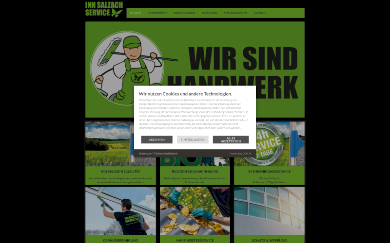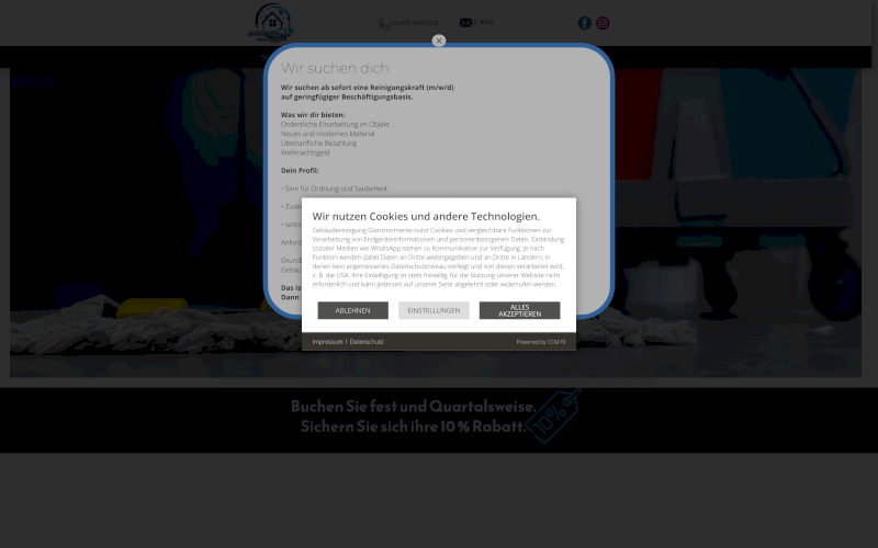 Das Herzstück von CCM19 für Ihre Gebäudereiniger Webseite, Onlineshop oder sonstige Applikation - der Cookie Banner für Gebäudereiniger. Mit diesem Banner realisieren Sie auf Ihrer Webseite die notwendige Zustimmung zum Setzen von diversen Cookies und zum ausführen von (Tracking)Skripten.
