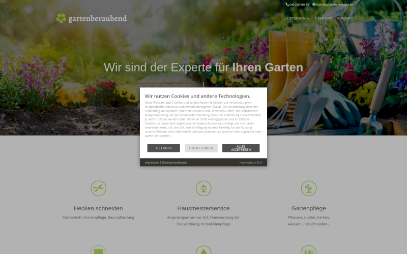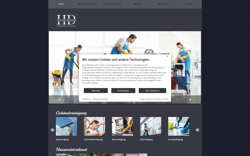 Das Herzstück von CCM19 für Ihre Hausmeisterservice Webseite, Onlineshop oder sonstige Applikation - der Cookie Banner für Hausmeisterservice. Mit diesem Banner realisieren Sie auf Ihrer Webseite die notwendige Zustimmung zum Setzen von diversen Cookies und zum ausführen von (Tracking)Skripten.