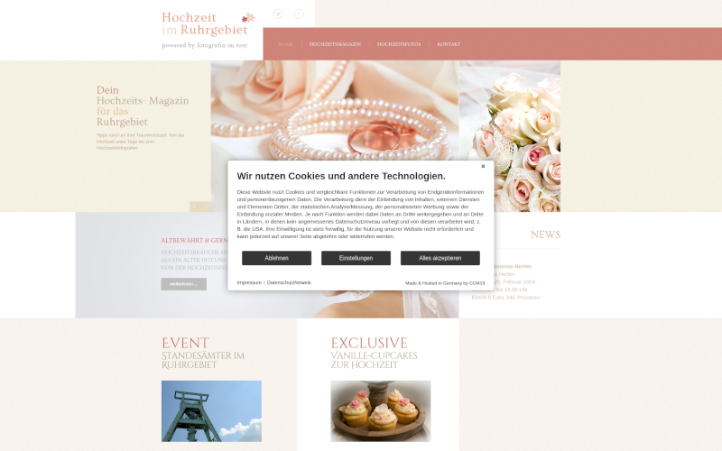 Entdecken Sie CCM19, den Cookie Consent Manager, speziell für Hochzeitsplaner entwickelt. Optimierung Ihrer Webseite beginnt hier! Erfahren Sie, wie CCM19 mit deutschem Support & ohne Datenübertragung ins Ausland Ihre Zustimmungsraten erhöht.