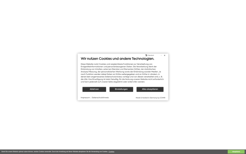 Das Herzstück von CCM19 für Ihre Hygieneartikel Hersteller Webseite, Onlineshop oder sonstige Applikation - der Cookie Banner für Hygieneartikel Hersteller. Mit diesem Banner realisieren Sie auf Ihrer Webseite die notwendige Zustimmung zum Setzen von diversen Cookies und zum ausführen von (Tracking)Skripten.