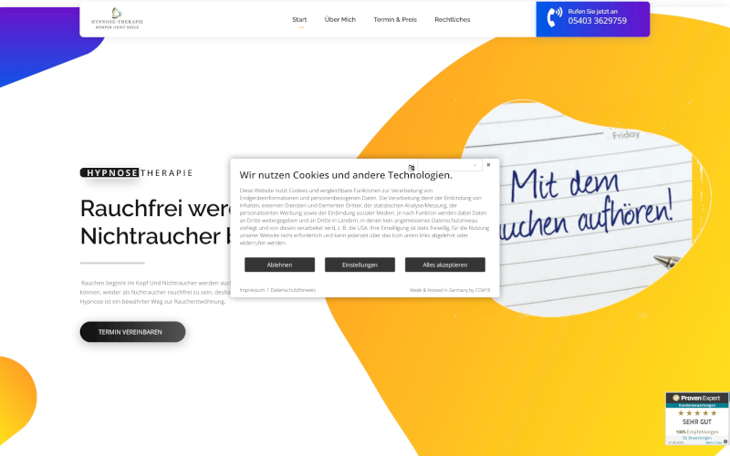 Das Herzstück von CCM19 für Ihre Hypnosetherapie Webseite, Onlineshop oder sonstige Applikation - der Cookie Banner für Hypnosetherapie. Mit diesem Banner realisieren Sie auf Ihrer Webseite die notwendige Zustimmung zum Setzen von diversen Cookies und zum ausführen von (Tracking)Skripten.