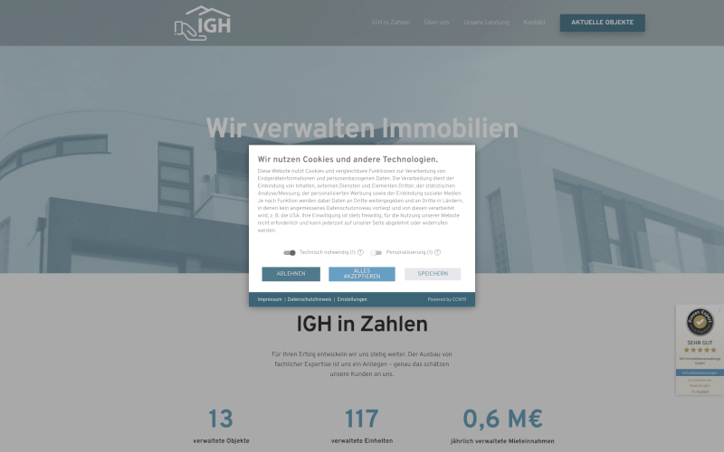 Mit über 173.114 Seitenbetreibern, die CCM19 bereits nutzen, darunter viele im Bereich Immobilienverwaltung, spricht der Erfolg für sich. Die hohe Zustimmungsrate und die rechtliche Sicherheit, die CCM19 bietet, machen es zu einer zuverlässigen Wahl für Ihre Webseite. Zusätzlich profitieren Sie von einem freundlichen und deutschsprachigen Kundensupport, der Sie bei jedem Schritt unterstützt.