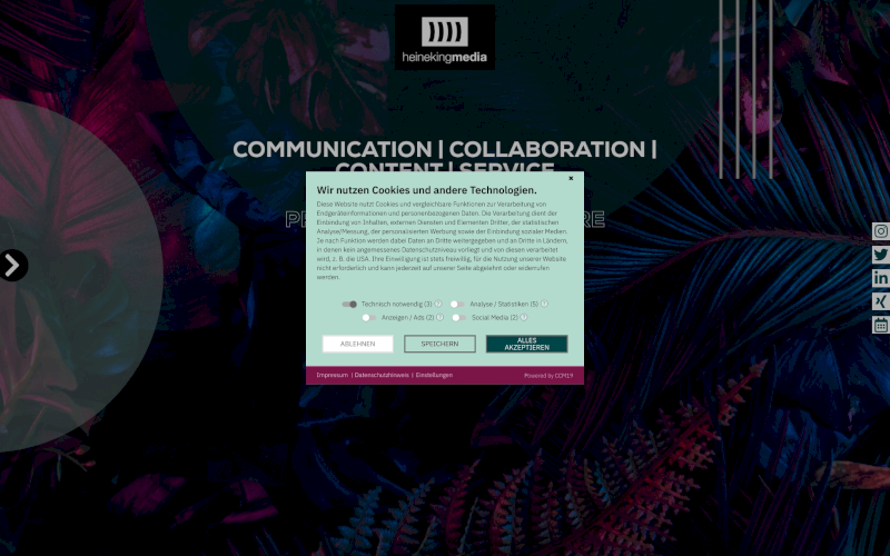Das Herzstück von CCM19 für Ihre Informationstechnologie Webseite, Onlineshop oder sonstige Applikation - der Cookie Banner für Informationstechnologie. Mit diesem Banner realisieren Sie auf Ihrer Webseite die notwendige Zustimmung zum Setzen von diversen Cookies und zum ausführen von (Tracking)Skripten.