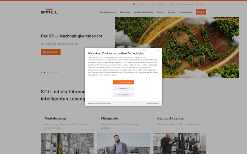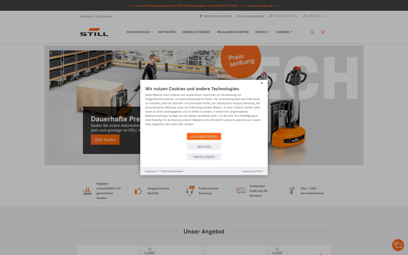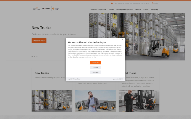 Das Herzstück von CCM19 für Ihre Intralogistik Webseite, Onlineshop oder sonstige Applikation - der Cookie Banner für Intralogistik. Mit diesem Banner realisieren Sie auf Ihrer Webseite die notwendige Zustimmung zum Setzen von diversen Cookies und zum ausführen von (Tracking)Skripten.
