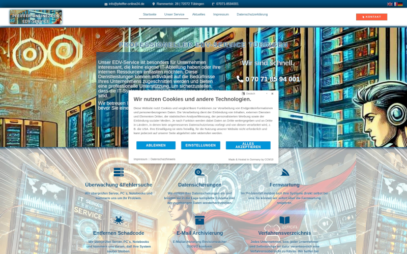 Das Herzstück von CCM19 für Ihre IT-Service Webseite, Onlineshop oder sonstige Applikation - der Cookie Banner für IT-Service. Mit diesem Banner realisieren Sie auf Ihrer Webseite die notwendige Zustimmung zum Setzen von diversen Cookies und zum ausführen von (Tracking)Skripten.