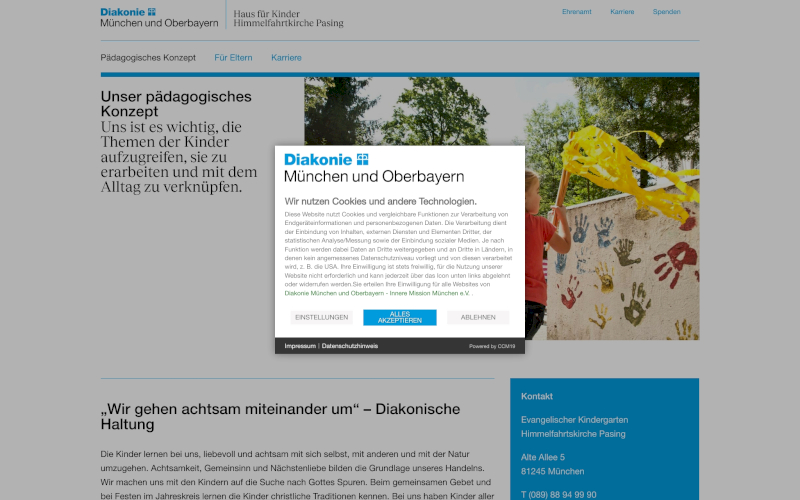 In der digitalen Welt von heute ist der Schutz der Privatsphäre im Internet unerlässlich, besonders in sensiblen Bereichen wie Kindergärten. CCM19 bietet einen Cookie Consent Manager (CCM), der speziell auf die Bedürfnisse von Kindergärten zugeschnitten ist. Mit seiner Hilfe können Webseitenbetreiber im Bereich Kindergärten den Datenschutz gemäß DSGVO und TDDDG gewährleisten und gleichzeitig ein benutzerfreundliches Online-Erlebnis bieten.