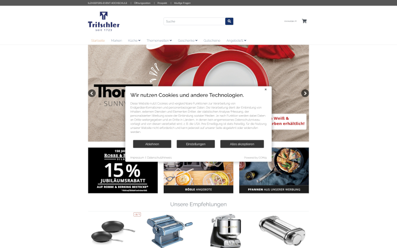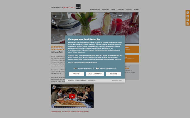 Das Herzstück von CCM19 für Ihre Kochschulen Webseite, Onlineshop oder sonstige Applikation - der Cookie Banner für Kochschulen. Mit diesem Banner realisieren Sie auf Ihrer Webseite die notwendige Zustimmung zum Setzen von diversen Cookies und zum ausführen von (Tracking)Skripten.