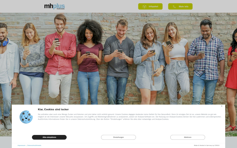 Das Herzstück von CCM19 für Ihre Krankenkassen & Kliniken Webseite, Onlineshop oder sonstige Applikation - der Cookie Banner für Krankenkassen & Kliniken. Mit diesem Banner realisieren Sie auf Ihrer Webseite die notwendige Zustimmung zum Setzen von diversen Cookies und zum ausführen von (Tracking)Skripten.