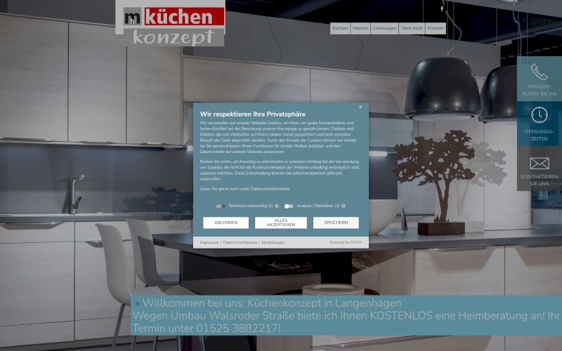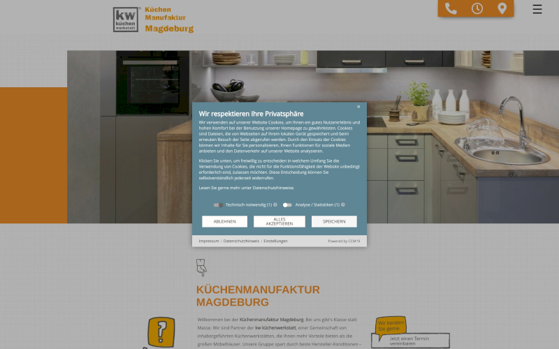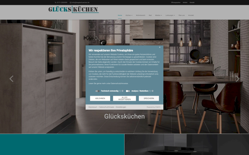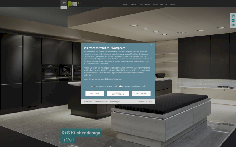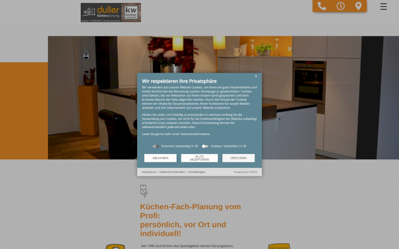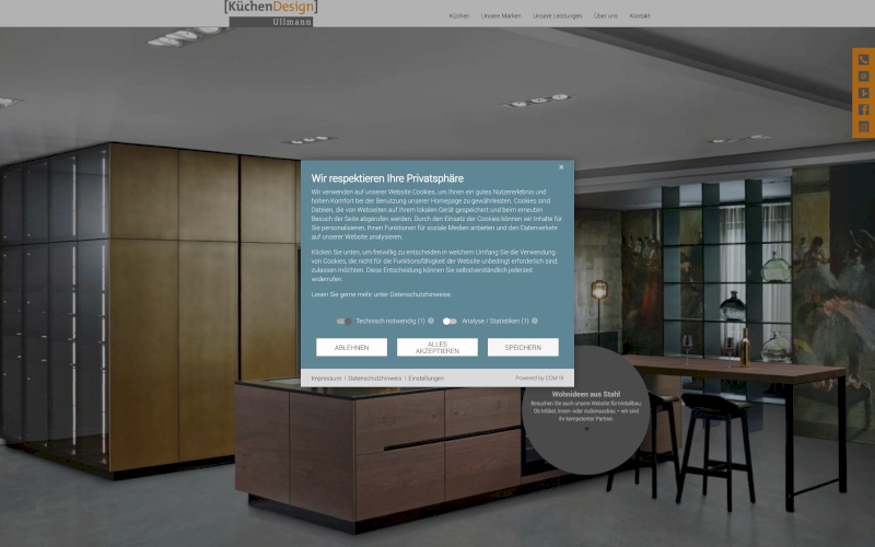 Das Herzstück von CCM19 für Ihre Küchenmanufaktur Webseite, Onlineshop oder sonstige Applikation - der Cookie Banner für Küchenmanufaktur. Mit diesem Banner realisieren Sie auf Ihrer Webseite die notwendige Zustimmung zum Setzen von diversen Cookies und zum ausführen von (Tracking)Skripten.