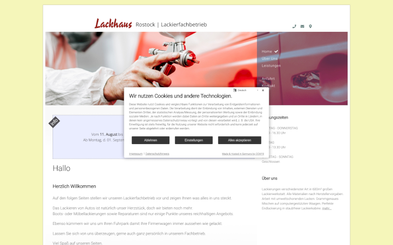 Entdecken Sie CCM19, den maßgeschneiderten Cookie Consent Manager speziell für Lackierereien. Optimieren Sie Ihre Datenschutzstrategie! Erhalten Sie mehr Zustimmungen mit unserem branchenspezifisch entwickelten CCM19. Steigern Sie die Effektivität Ihres Online-Auftritts!
