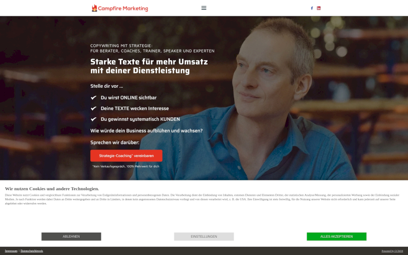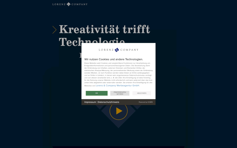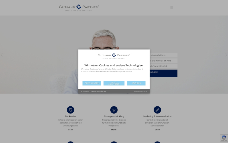 Das Herzstück von CCM19 für Ihre Marketingunternehmen Webseite, Onlineshop oder sonstige Applikation - der Cookie Banner für Marketingunternehmen. Mit diesem Banner realisieren Sie auf Ihrer Webseite die notwendige Zustimmung zum Setzen von diversen Cookies und zum ausführen von (Tracking)Skripten.
