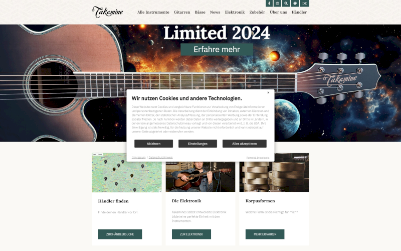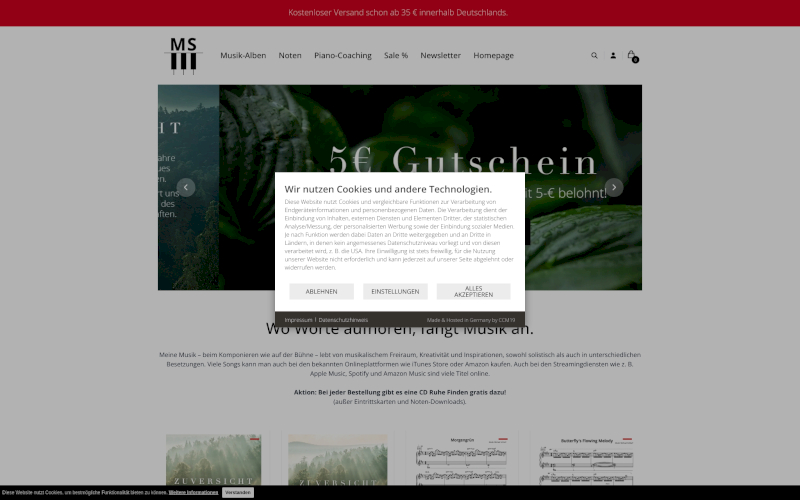 Das Herzstück von CCM19 für Ihre Musikgeschäfte Webseite, Onlineshop oder sonstige Applikation - der Cookie Banner für Musikgeschäfte. Mit diesem Banner realisieren Sie auf Ihrer Webseite die notwendige Zustimmung zum Setzen von diversen Cookies und zum ausführen von (Tracking)Skripten.