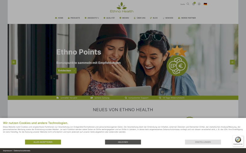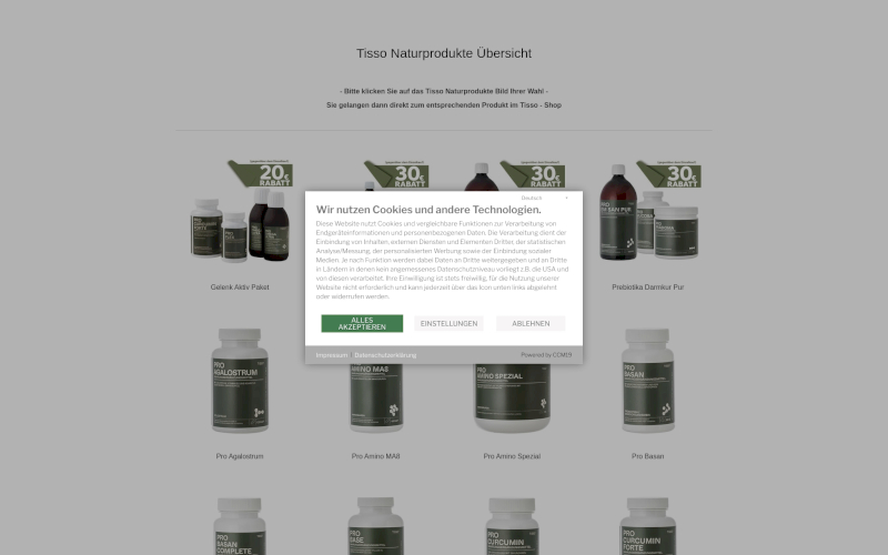 Das Herzstück von CCM19 für Ihre Nahrungsergänzungsmittel Großhändler Webseite, Onlineshop oder sonstige Applikation - der Cookie Banner für Nahrungsergänzungsmittel Großhändler. Mit diesem Banner realisieren Sie auf Ihrer Webseite die notwendige Zustimmung zum Setzen von diversen Cookies und zum ausführen von (Tracking)Skripten.