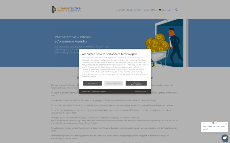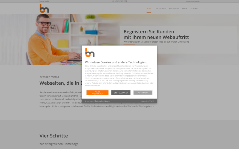 Das Herzstück von CCM19 für Ihre Onlineagenturen Webseite, Onlineshop oder sonstige Applikation - der Cookie Banner für Onlineagenturen. Mit diesem Banner realisieren Sie auf Ihrer Webseite die notwendige Zustimmung zum Setzen von diversen Cookies und zum ausführen von (Tracking)Skripten.