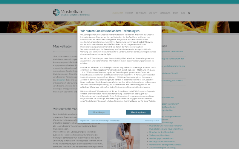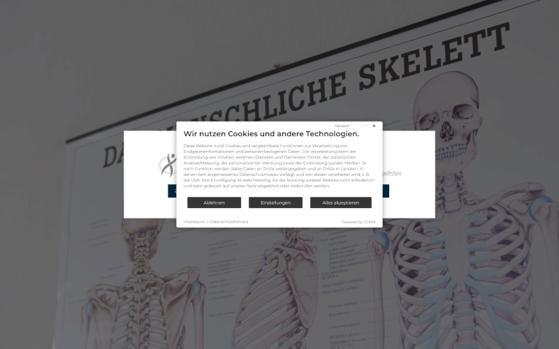 Das Herzstück von CCM19 für Ihre Physiotherapeuten Webseite, Onlineshop oder sonstige Applikation - der Cookie Banner für Physiotherapeuten. Mit diesem Banner realisieren Sie auf Ihrer Webseite die notwendige Zustimmung zum Setzen von diversen Cookies und zum ausführen von (Tracking)Skripten.