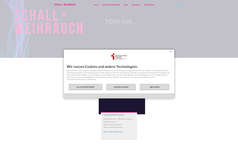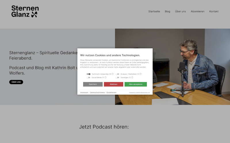 Das Herzstück von CCM19 für Ihre Podcaster Webseite, Onlineshop oder sonstige Applikation - der Cookie Banner für Podcaster. Mit diesem Banner realisieren Sie auf Ihrer Webseite die notwendige Zustimmung zum Setzen von diversen Cookies und zum ausführen von (Tracking)Skripten.