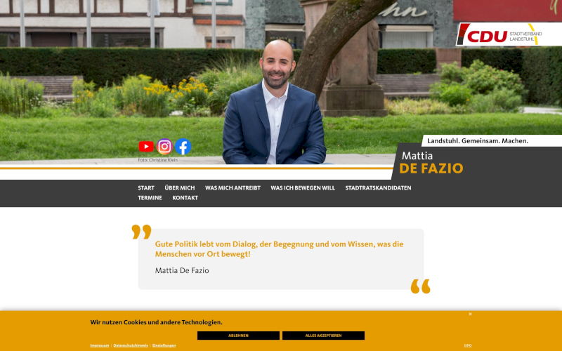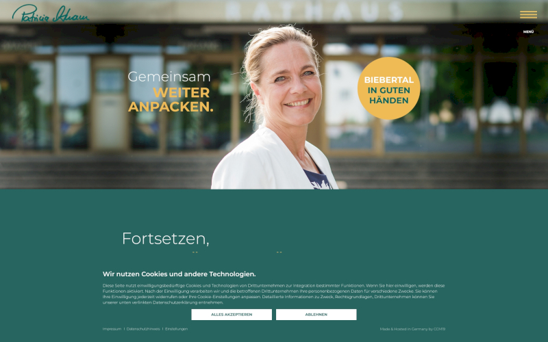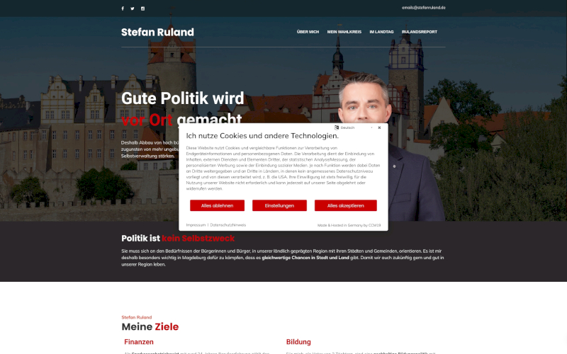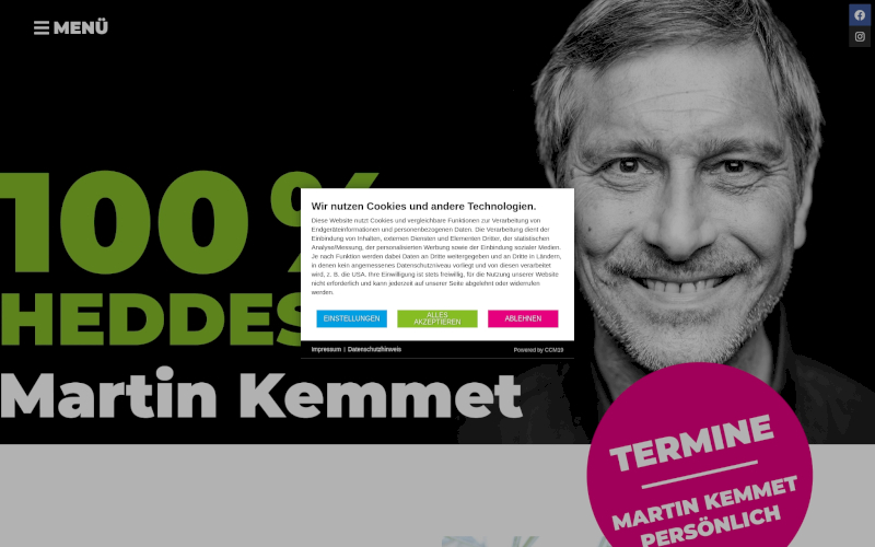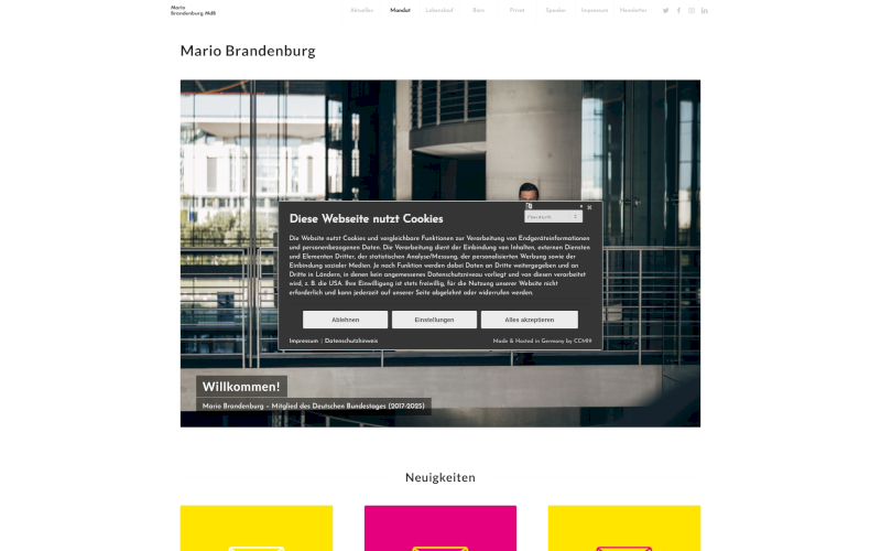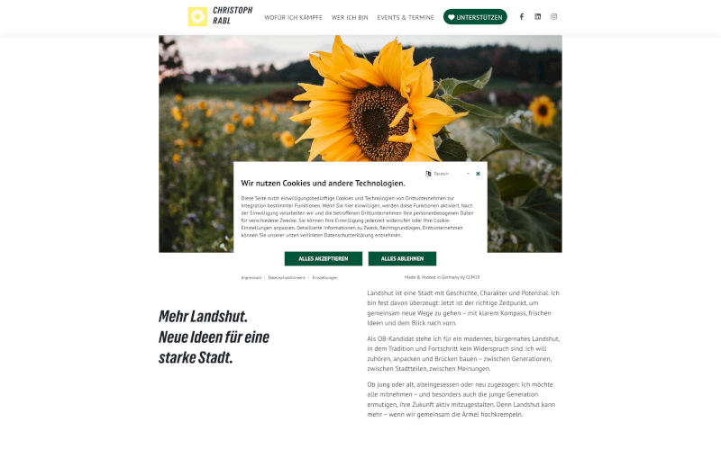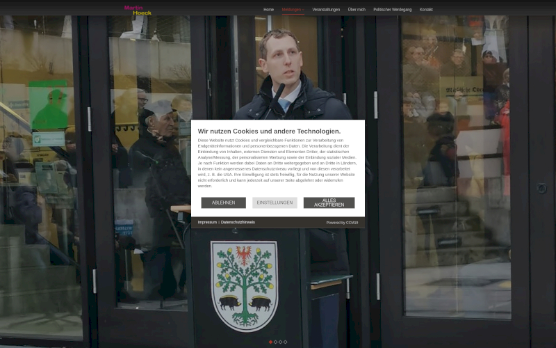 Das Herzstück von CCM19 für Ihre Politiker Webseite, Onlineshop oder sonstige Applikation - der Cookie Banner für Politiker. Mit diesem Banner realisieren Sie auf Ihrer Webseite die notwendige Zustimmung zum Setzen von diversen Cookies und zum ausführen von (Tracking)Skripten.