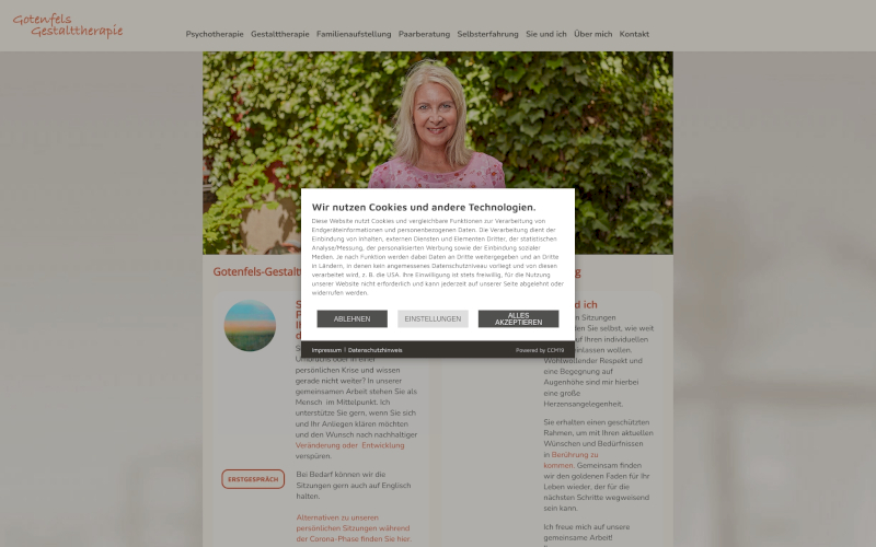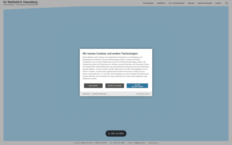 Das Herzstück von CCM19 für Ihre Psychotherapeuten Webseite, Onlineshop oder sonstige Applikation - der Cookie Banner für Psychotherapeuten. Mit diesem Banner realisieren Sie auf Ihrer Webseite die notwendige Zustimmung zum Setzen von diversen Cookies und zum ausführen von (Tracking)Skripten.