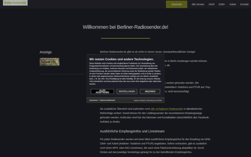 Das Herzstück von CCM19 für Ihre Radiosender Webseite, Onlineshop oder sonstige Applikation - der Cookie Banner für Radiosender. Mit diesem Banner realisieren Sie auf Ihrer Webseite die notwendige Zustimmung zum Setzen von diversen Cookies und zum ausführen von (Tracking)Skripten.