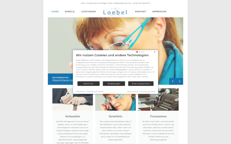 Das Herzstück von CCM19 für Ihre Rechtsberatung Webseite, Onlineshop oder sonstige Applikation - der Cookie Banner für Rechtsberatung. Mit diesem Banner realisieren Sie auf Ihrer Webseite die notwendige Zustimmung zum Setzen von diversen Cookies und zum ausführen von (Tracking)Skripten.