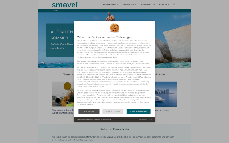 Das Herzstück von CCM19 für Ihre Reisebüros Webseite, Onlineshop oder sonstige Applikation - der Cookie Banner für Reisebüros. Mit diesem Banner realisieren Sie auf Ihrer Webseite die notwendige Zustimmung zum Setzen von diversen Cookies und zum ausführen von (Tracking)Skripten.