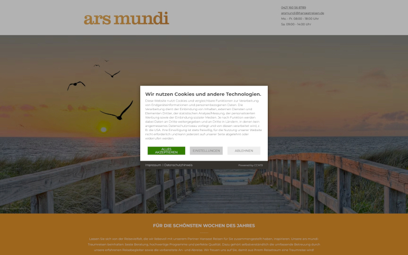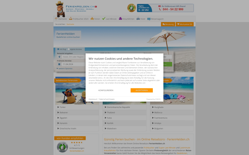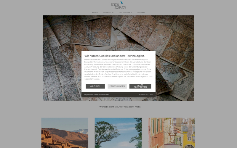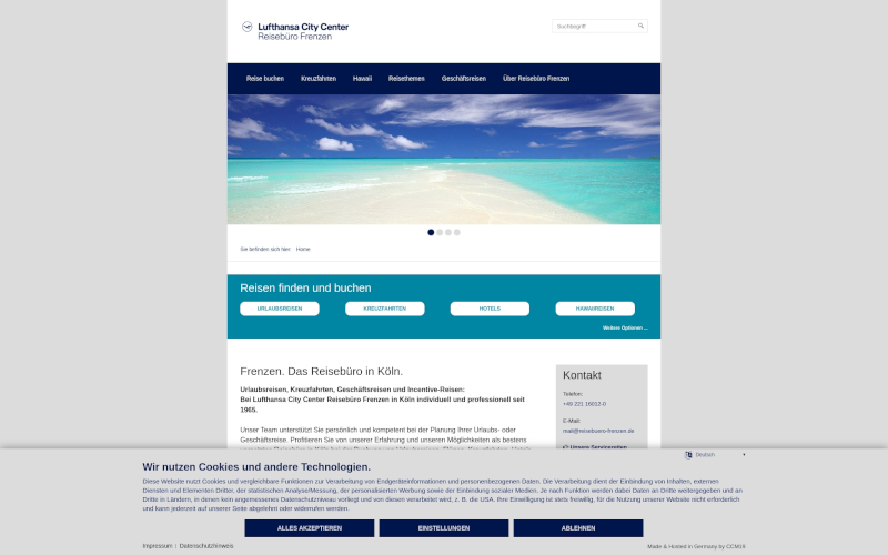 Suchen Sie den besten Cookie Consent Manager für Reiseveranstalter? Entdecken Sie CCM19 - speziell entwickelt, um Ihre Datenschutzanforderungen zu erfüllen! Erleben Sie eine Cookie-Banner-Lösung, die Zustimmungsraten steigert, ohne Daten ins Ausland zu übertragen. Perfekt für die Reisebranche!