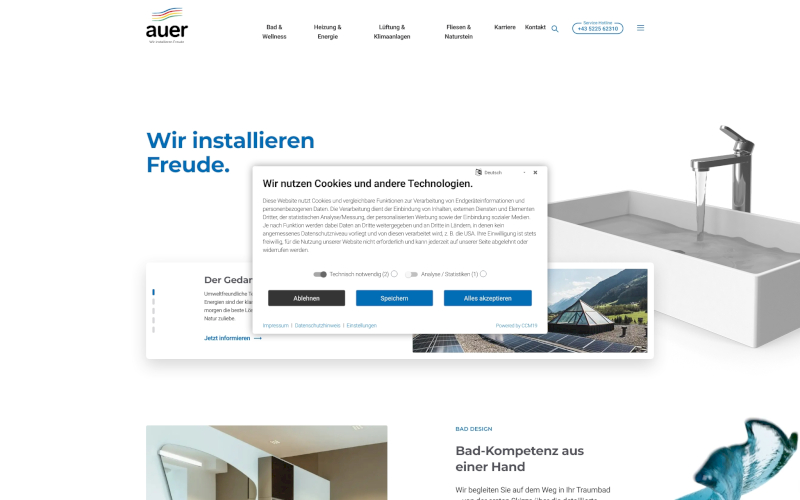 Das Herzstück von CCM19 für Ihre Sanitäranlagen Webseite, Onlineshop oder sonstige Applikation - der Cookie Banner für Sanitäranlagen. Mit diesem Banner realisieren Sie auf Ihrer Webseite die notwendige Zustimmung zum Setzen von diversen Cookies und zum ausführen von (Tracking)Skripten.