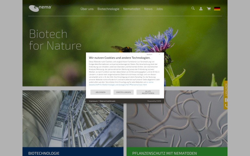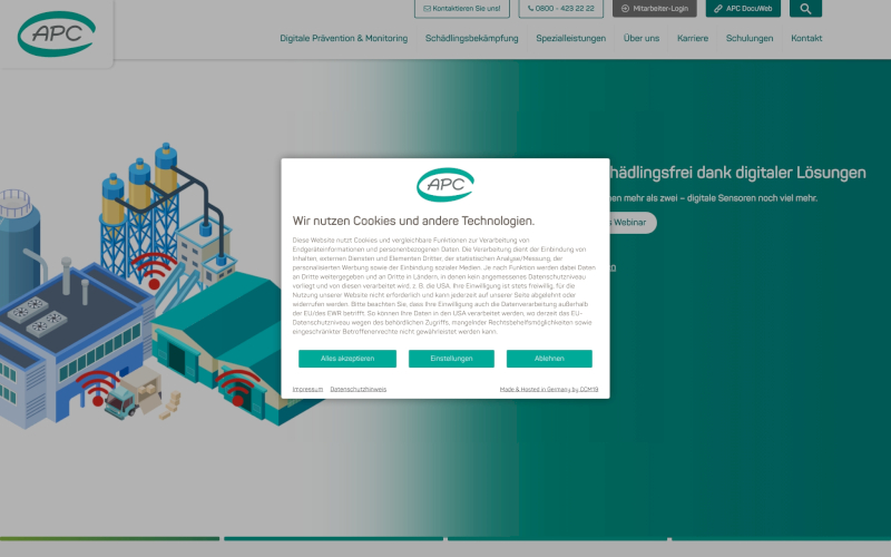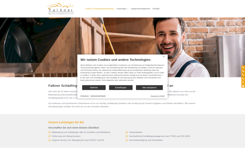 Das Herzstück von CCM19 für Ihre Schädlingsbekämpfung Webseite, Onlineshop oder sonstige Applikation - der Cookie Banner für Schädlingsbekämpfung. Mit diesem Banner realisieren Sie auf Ihrer Webseite die notwendige Zustimmung zum Setzen von diversen Cookies und zum ausführen von (Tracking)Skripten.